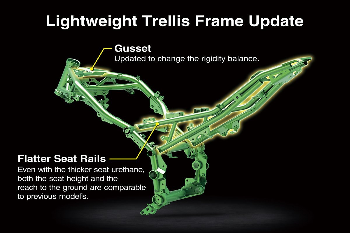 Compared to the Kawasaki traditional Uni-Trak rear suspension, which mounts the shock unit vertically, with Horizontal Back-link Rear Suspension, the shock unit is almost horizontal. The original Kawasaki suspension arrangement locates the shock unit very close to the bike's center of gravity, greatly contributing to mass centralization. And because there is no linkage or shock unit protruding beneath the swingarm, this frees up space for a larger exhaust pre-chamber (an exhaust expansion chamber situated just upstream of the silencer). With a larger pre-chamber, silencer volume can be reduced, and heavy exhaust components can be concentrated closer to the center of the bike, further contributing to mass centralization. The result is greatly improved handling.