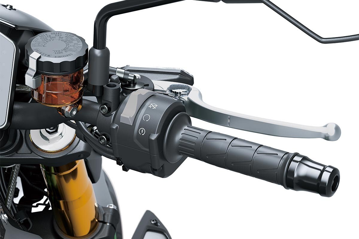 Full-colour TFT screen with digital speedometer, digital tachometer, gear position indicator, shift lamp, fuel gauge, odometer, dual trip meters, current and average fuel consumption, remaining range, average speed, total time, coolant temperature, clock, battery voltage, KQS, Electric Cruise Control, Kawasaki service reminder, oil change reminder, Riding Mode indicator, smartphone call and mail notices, smartphone battery level, headset, voice command status and riding log status indicators, RIDEOLOGY THE APP indicator, Economical Riding Indicator, and turn-by-turn navigation display; and lean angle indicator, acceleration/deceleration indicator, and maximum lean angle (on the Type 2 display)